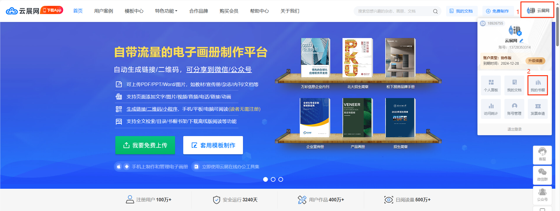 將鼠標(biāo)懸停在云展網(wǎng)首頁(yè)右上角我的賬號(hào)上,點(diǎn)擊【我的書櫥】進(jìn)入界面。
