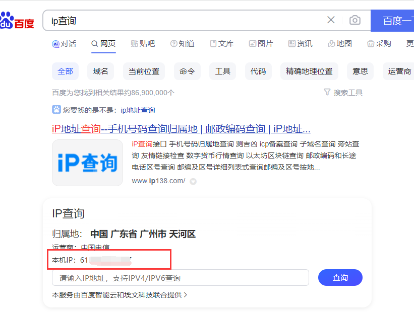 在電腦或者手機(jī)的瀏覽器上搜索【IP查詢】就可以獲取當(dāng)前的網(wǎng)絡(luò)IP地址。