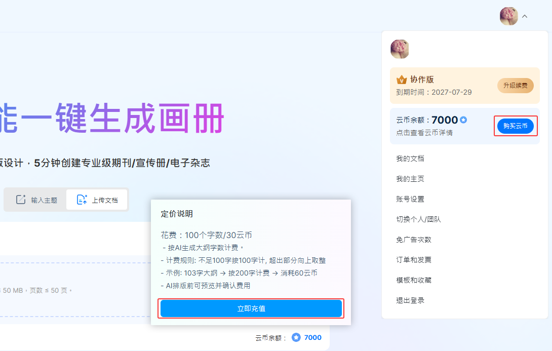 點(diǎn)擊右上角的頭像,或者在【上傳文件】按鈕下方, 鼠標(biāo)懸浮在云幣數(shù)值上,均可查看當(dāng)前賬號剩余云幣或點(diǎn)擊【購買云幣】、【立即充值】,根據(jù)自身需要選擇購買更多云幣。