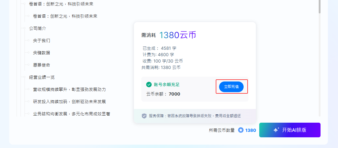 收費(fèi)時機(jī): 大綱生成完成后,用戶瀏覽計(jì)費(fèi)明細(xì),點(diǎn)擊【開始AI排版】按鈕,即扣除云幣。