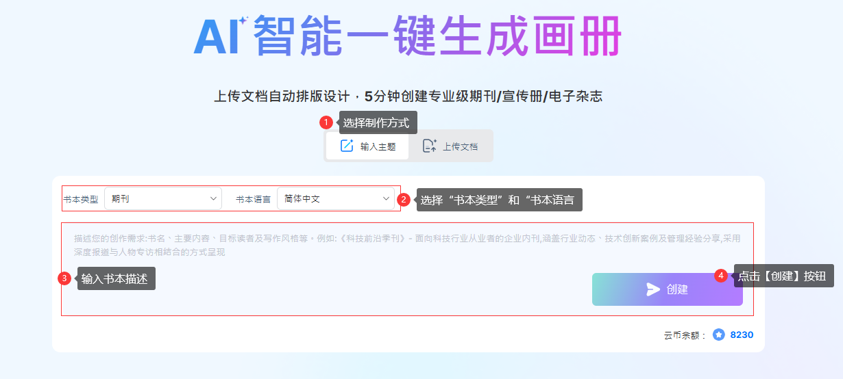 1). 點(diǎn)擊【輸入主題】→ 選擇【書籍類型】→ 選擇【書籍語言】→ 在文本框中輸入主題描述 → 點(diǎn)擊【創(chuàng)建】