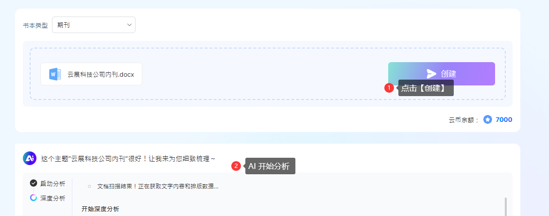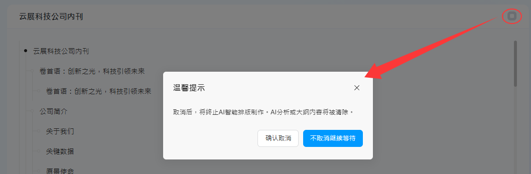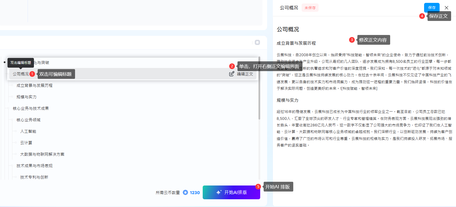2). 等待AI分析主題并生成大綱 → 編輯大綱標(biāo)題或正文 → 預(yù)覽需消耗的云幣→ 點(diǎn)擊【開始AI排版】進(jìn)入多媒體編輯器排版。
