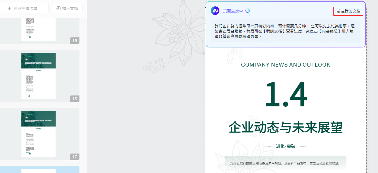(3)點(diǎn)擊【開始AI排版】后, 即進(jìn)入多媒體編輯器, AI將會逐一渲染頁面。無需等待生成完成,您可點(diǎn)擊【前往我的文檔】繼續(xù)其他創(chuàng)作。