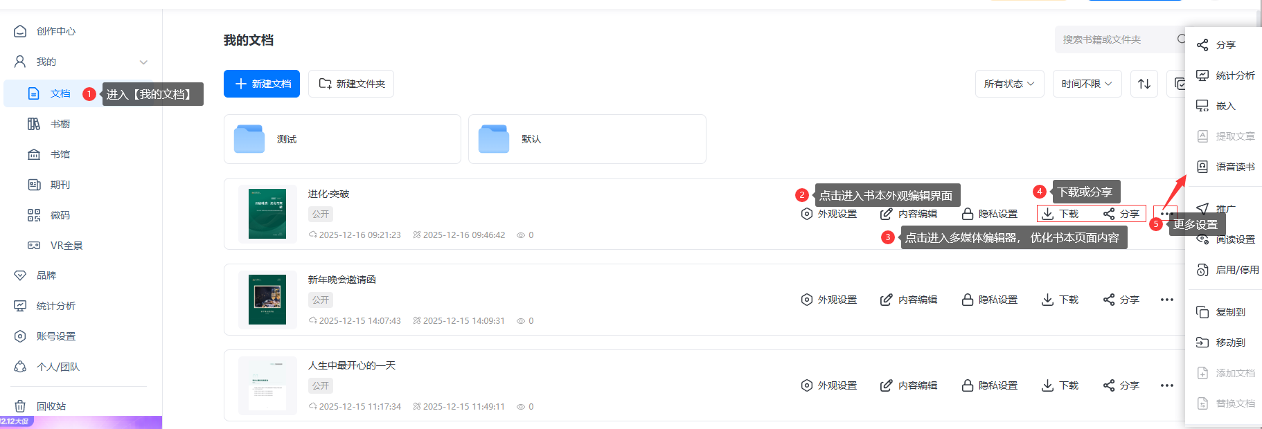 最終,書本將顯示在【我的文檔】中。 您可以進(jìn)一步編輯優(yōu)化, 或進(jìn)行其他操作, 如下載或分享。