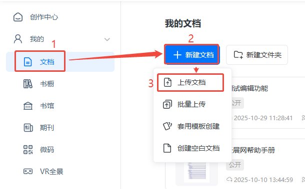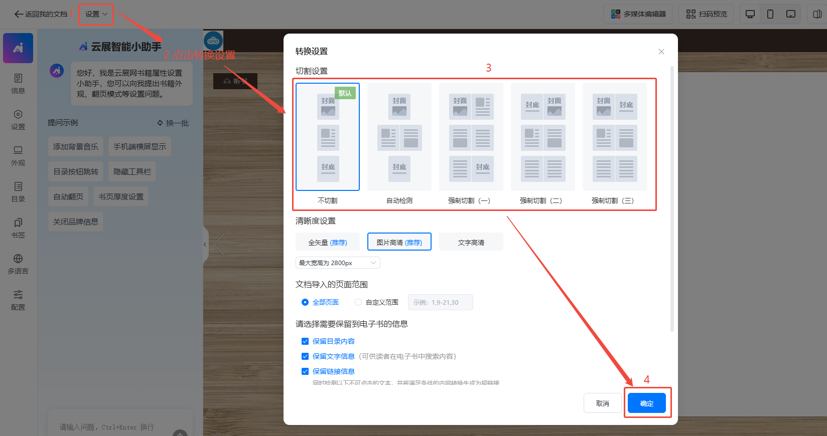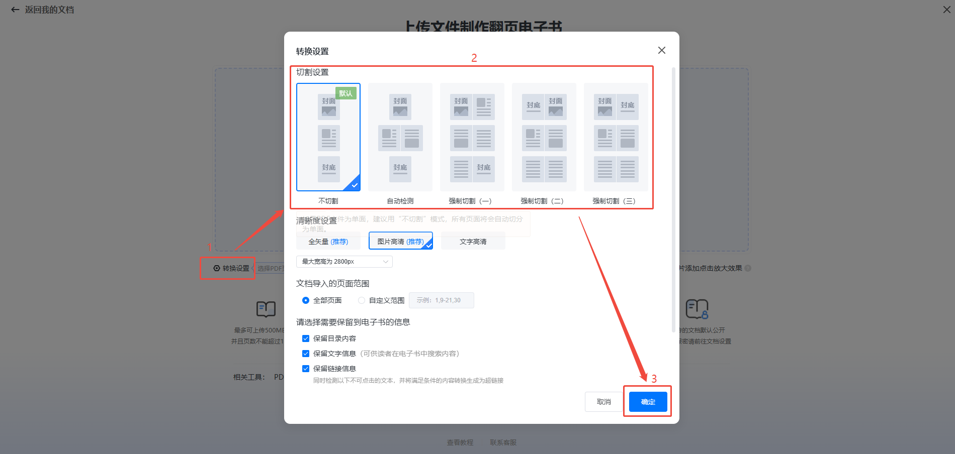 在【文檔】頁面,點(diǎn)擊【新建文檔】里面的【上傳文檔】,點(diǎn)擊【轉(zhuǎn)換設(shè)置】,選擇切割方式后點(diǎn)擊【確定】。