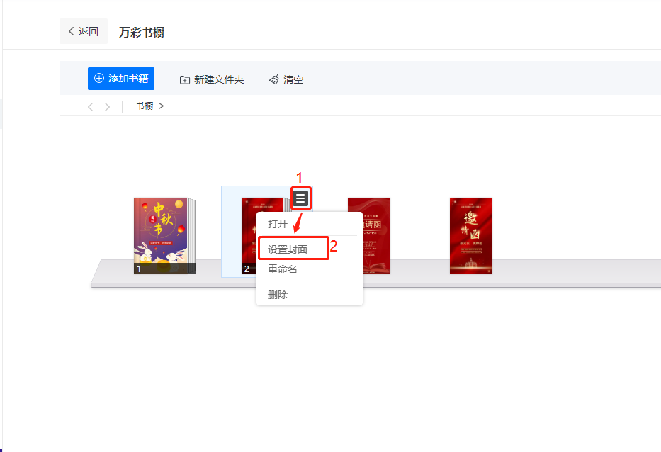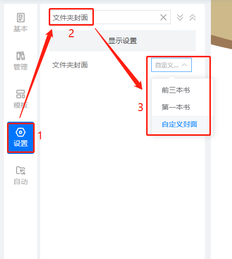 書櫥里的文件夾可以設置封面,使其看起來更美觀,書櫥文件夾封面有三種類型,分別是:顯示第一本書、顯示前三本書、自定義封面。