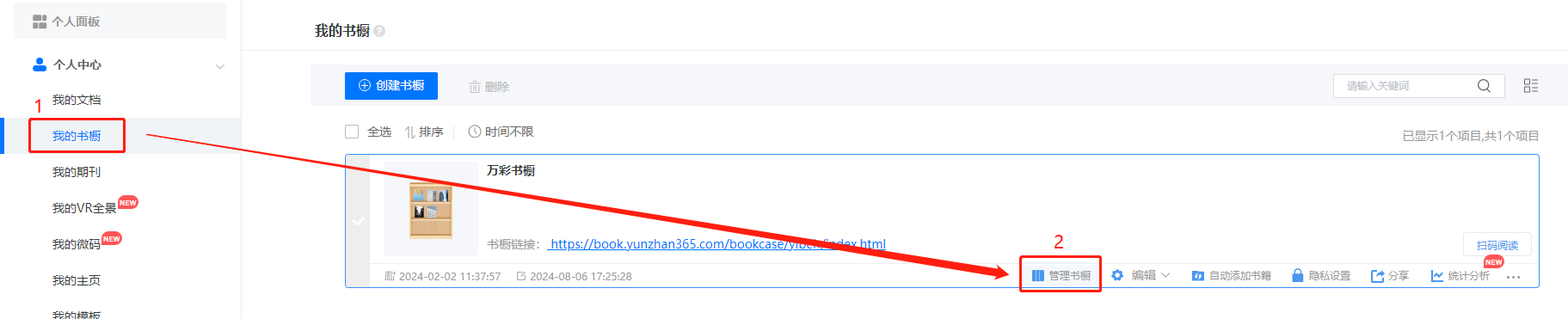(1)點擊【我的書櫥】找到對應書櫥,點擊【管理書櫥】,進入管理書櫥界面。