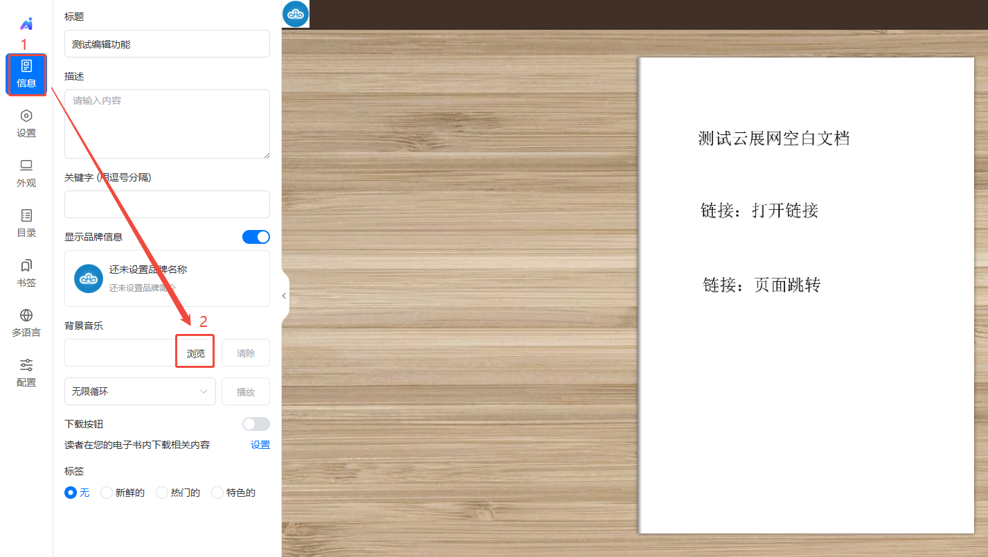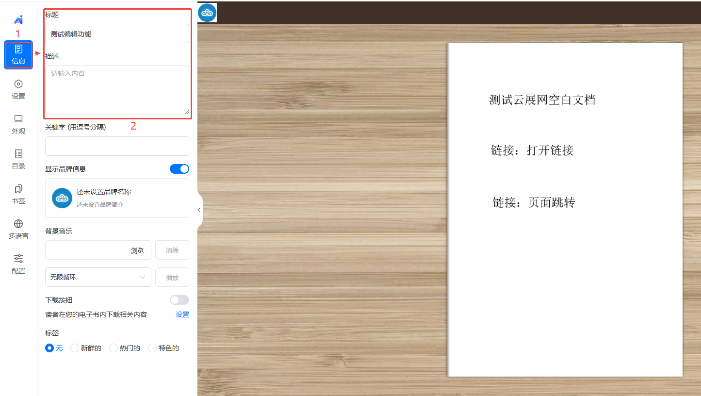 電子畫冊(cè)的基本信息包含標(biāo)題、描述、品牌信息、背景音樂、下載按鈕。