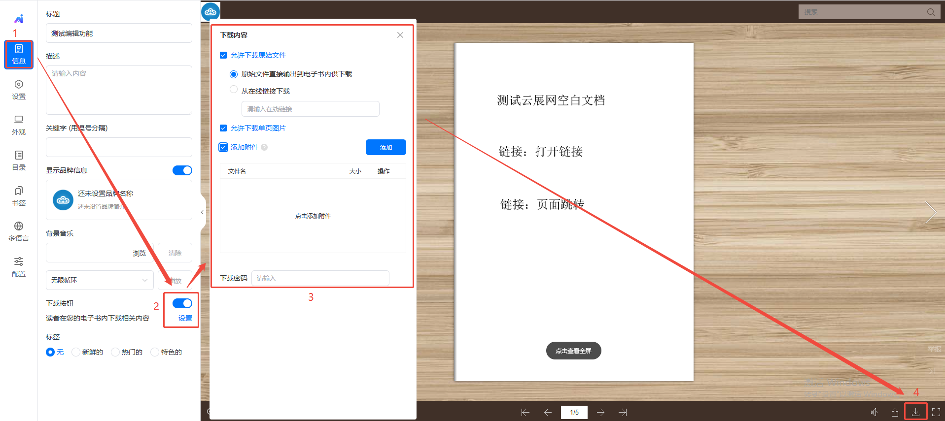 如果想要開放給讀者下載原始文件、單頁(yè)圖片、附件的話,可以打開下載按鈕,點(diǎn)擊【信息】,下方打開下載按鈕,電子書的工具欄上就會(huì)出現(xiàn)下載按鈕,然后點(diǎn)擊【設(shè)置】,設(shè)置下載內(nèi)容。