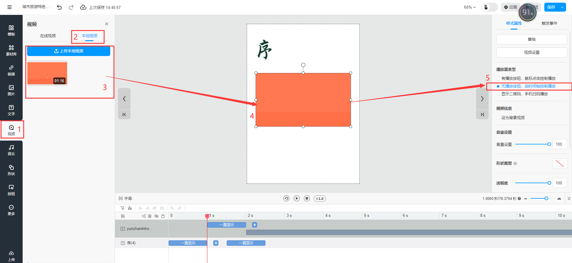 點擊【視頻】,點擊【上傳本地視頻】,將視頻添加的頁面上,然后選擇【無按鈕,由時間軸控制播放】