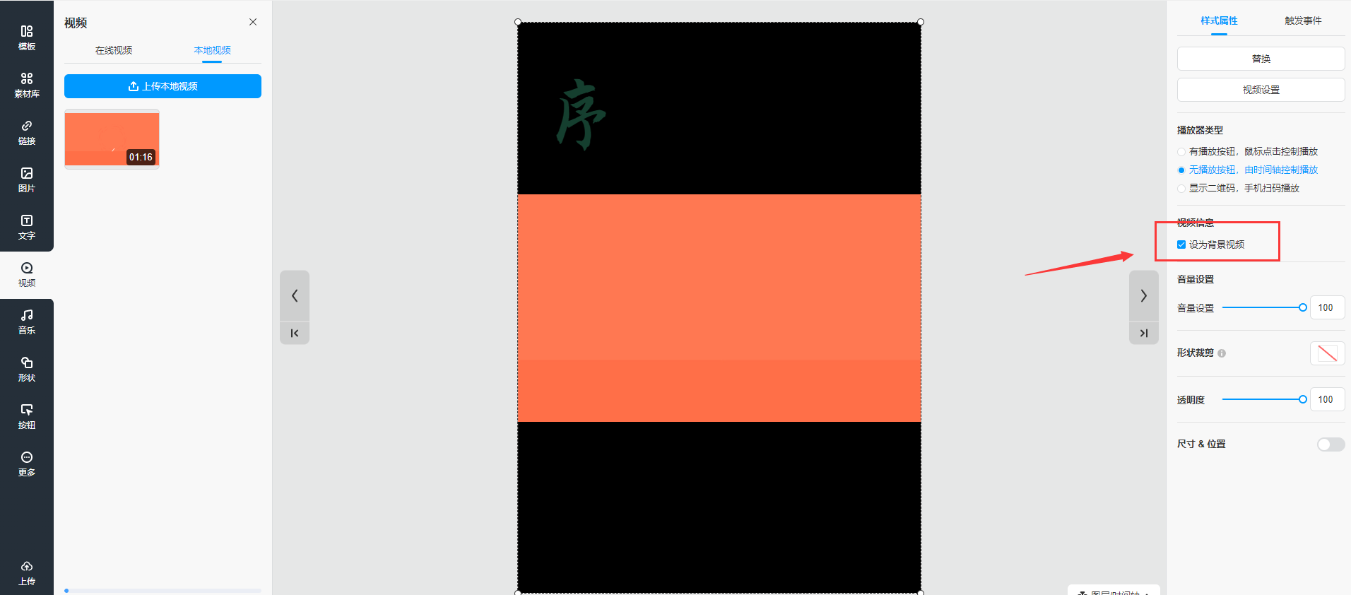 如果想要設(shè)置該視頻為頁面背景,也就是在一整個頁面播放視頻,可以將該視頻設(shè)置為背景視頻