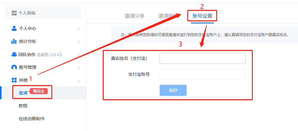 點擊【邀請】,然后點擊【賬號設(shè)置】,下方填寫支付寶真實姓名和支付寶賬號,并保存。