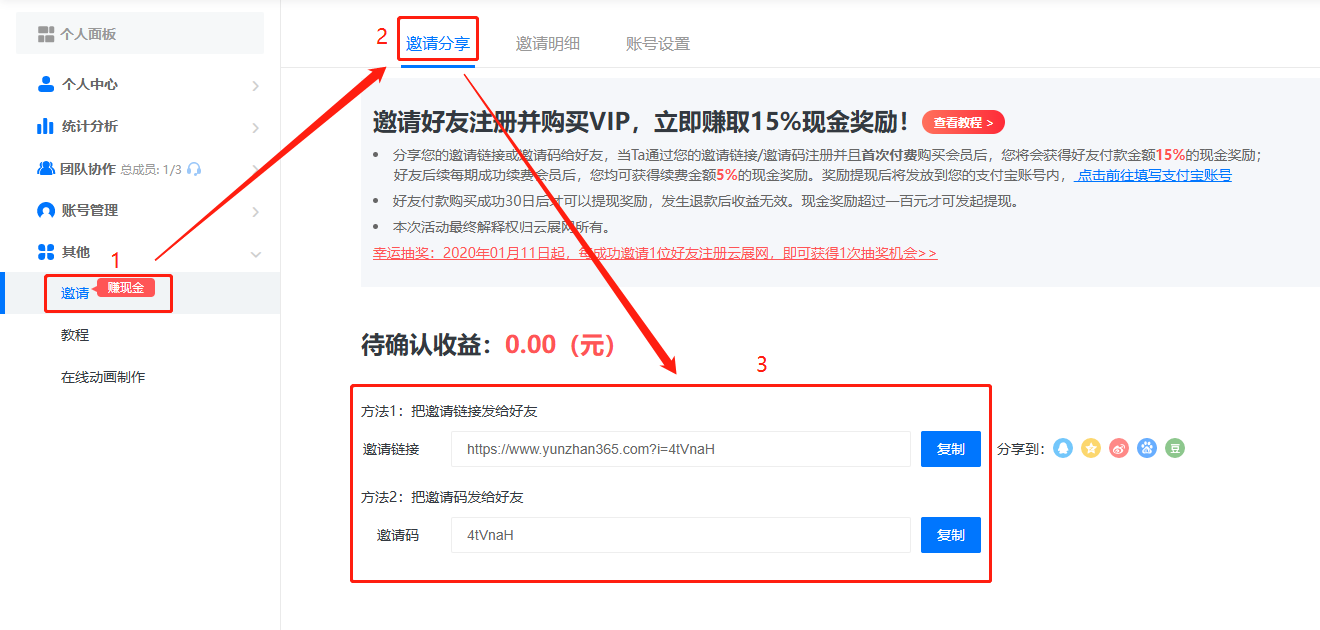 如何用云展網(wǎng)邀請好友購買會員賺現(xiàn)金獎勵?只需要分享您的邀請鏈接或邀請碼給好友,當(dāng)好友通過您的邀請鏈接或者邀請碼注冊,并且購買付費會員后,您將獲得相應(yīng)的現(xiàn)金獎勵。