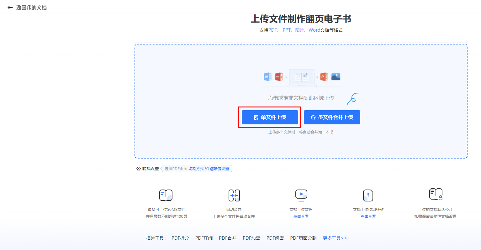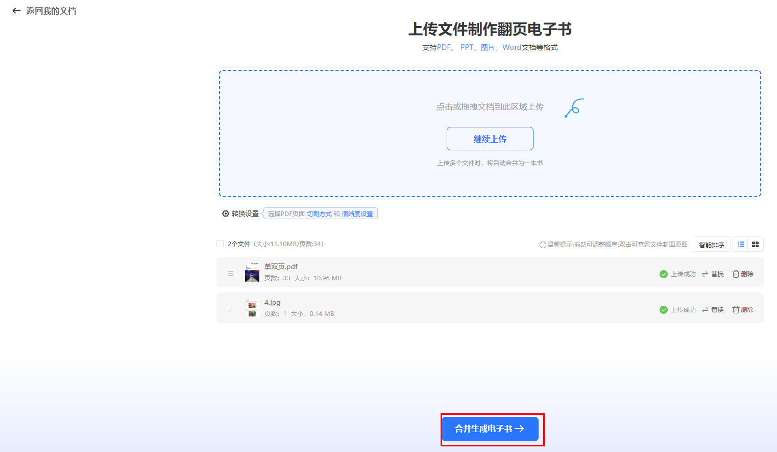 多個(gè)文件上傳合并為一個(gè)電子書,支持PDF/圖片/PPT/word格式。