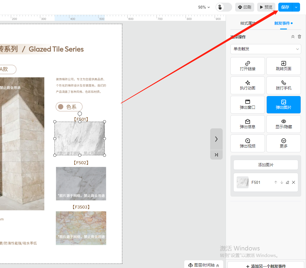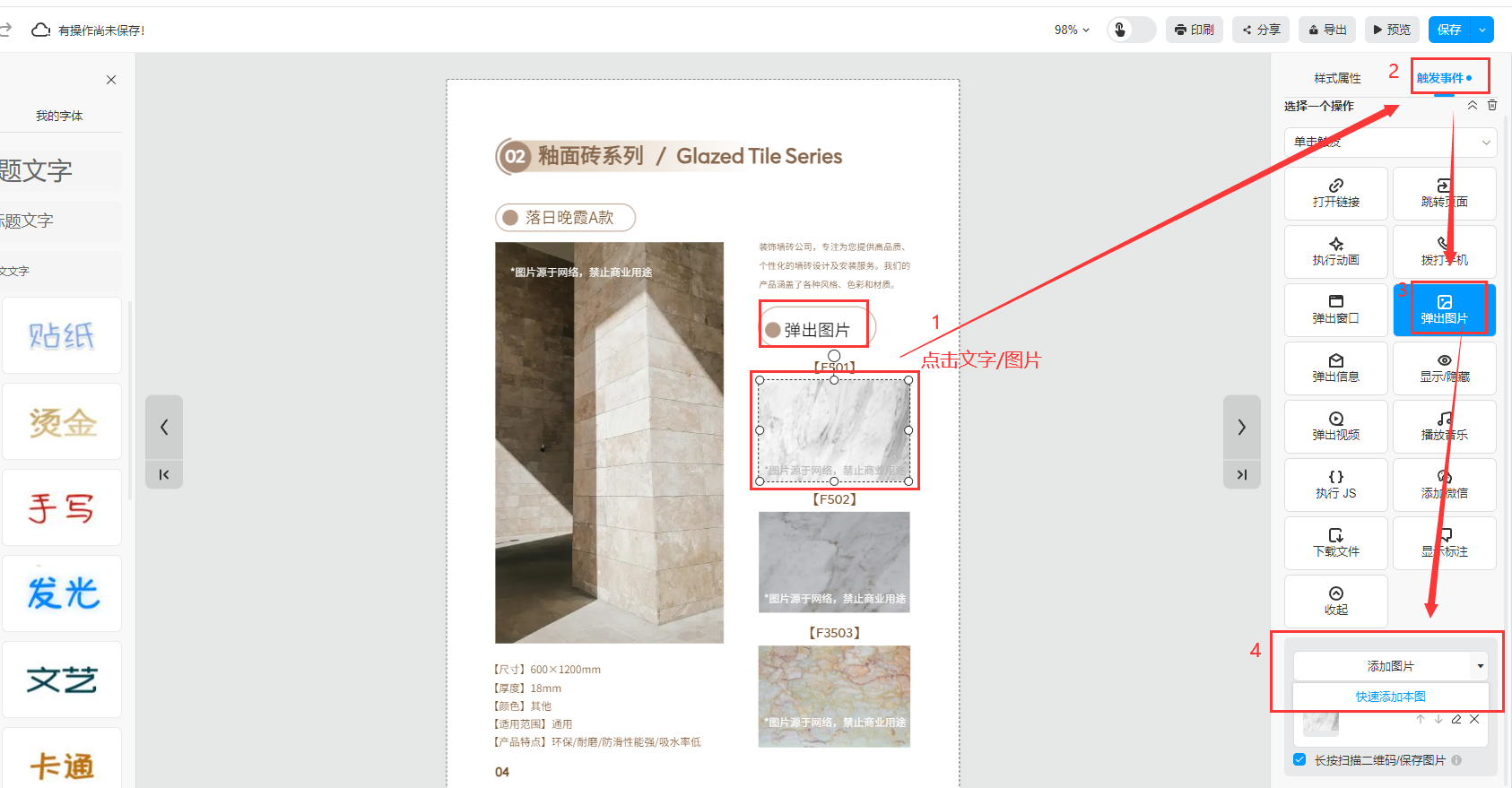 選中需要設(shè)置的文字或者圖片,然后在【觸發(fā)事件】選擇【彈出圖片】點(diǎn)擊添加圖片;如果是選擇圖片設(shè)置彈出大圖,可直接點(diǎn)擊【快速添加本圖】快速添加圖片