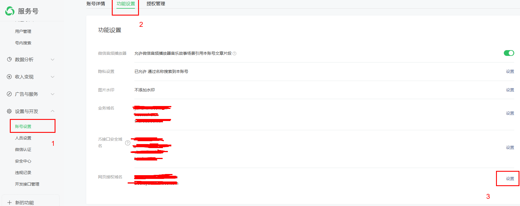 1)登錄微信公眾號(hào),設(shè)置與開(kāi)發(fā),賬號(hào)設(shè)置,功能設(shè)置,點(diǎn)擊網(wǎng)頁(yè)授權(quán)域名按鈕