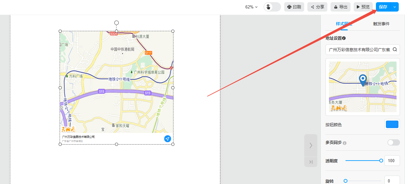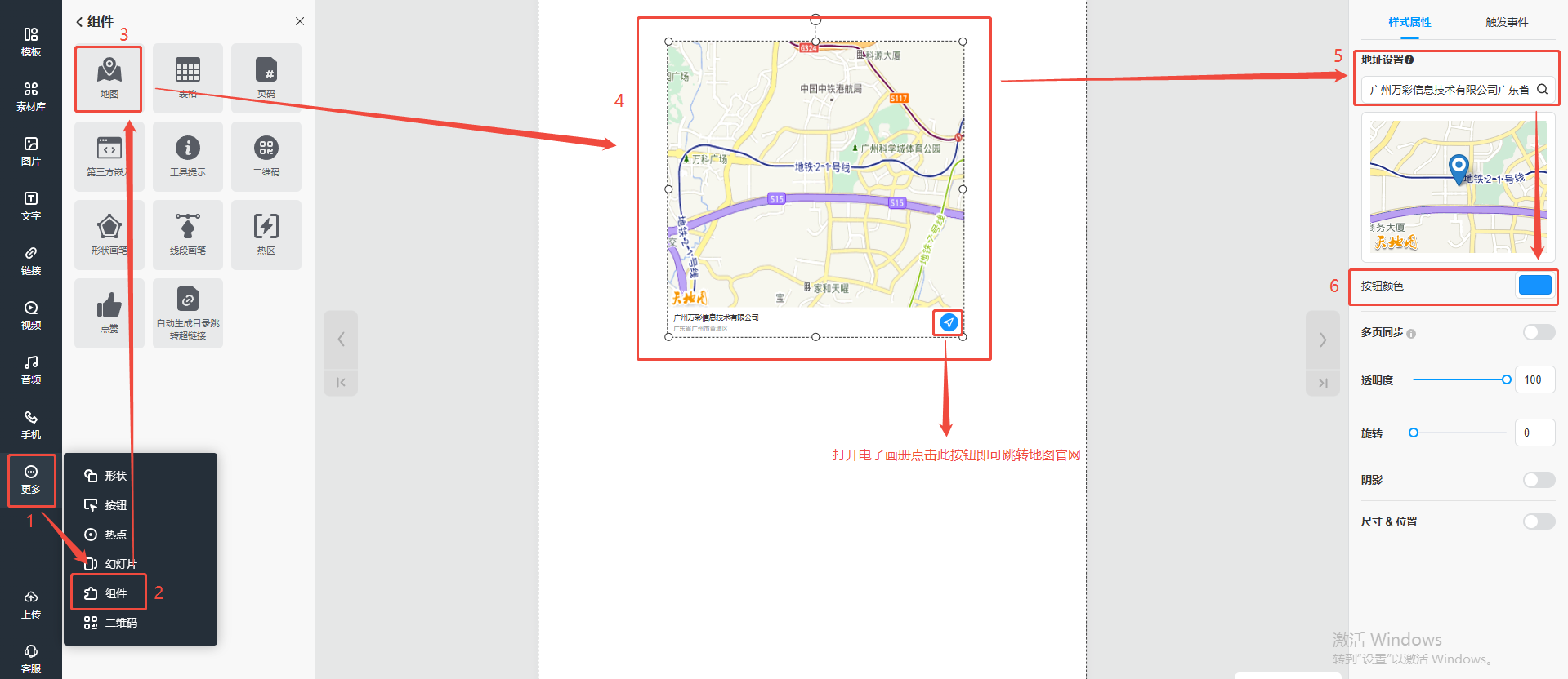 點擊【更多】,選擇【組件】,然后點擊【地圖】,在頁面上就會出現(xiàn)一個地圖板塊,在右側【地址設置】輸入目的地,設置【按鈕顏色】即可。