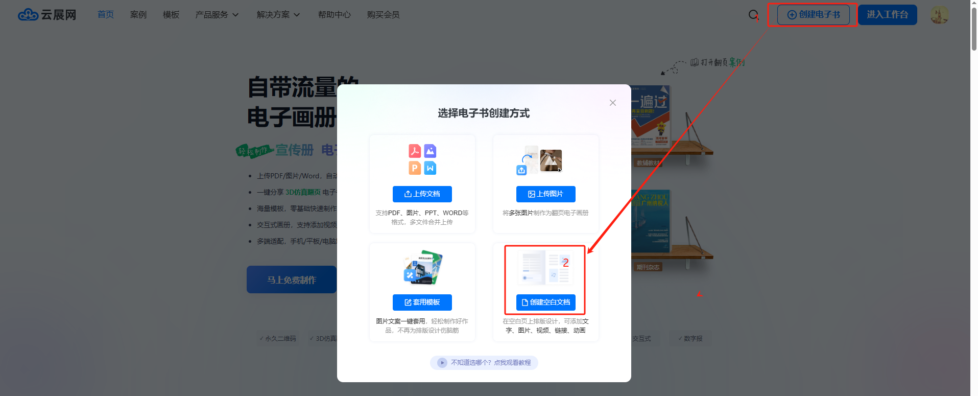 創(chuàng)建空白文檔制作電子書。設(shè)置電子書標(biāo)題和電子書尺寸,點(diǎn)擊完成創(chuàng)建后,即可進(jìn)入【多媒體編輯器】。