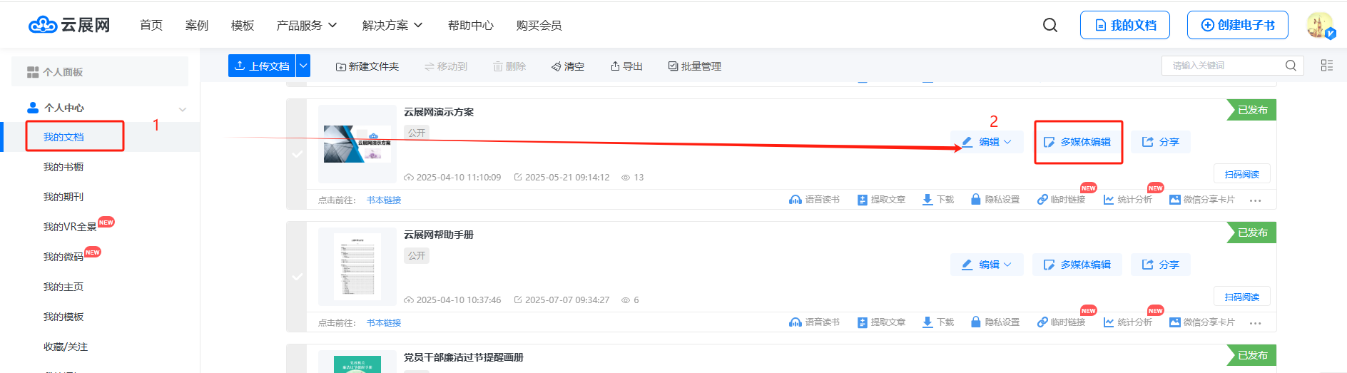 【我的文檔】/【文檔】頁(yè)面,找到你想編輯的電子書,選擇【多媒體編輯】/【內(nèi)容編輯】進(jìn)入多媒體編輯界面。