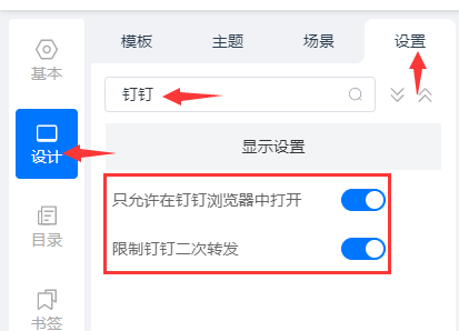 2.點擊“設計”,點擊“設置”,搜索框搜索“釘釘”,打開以下兩個配置