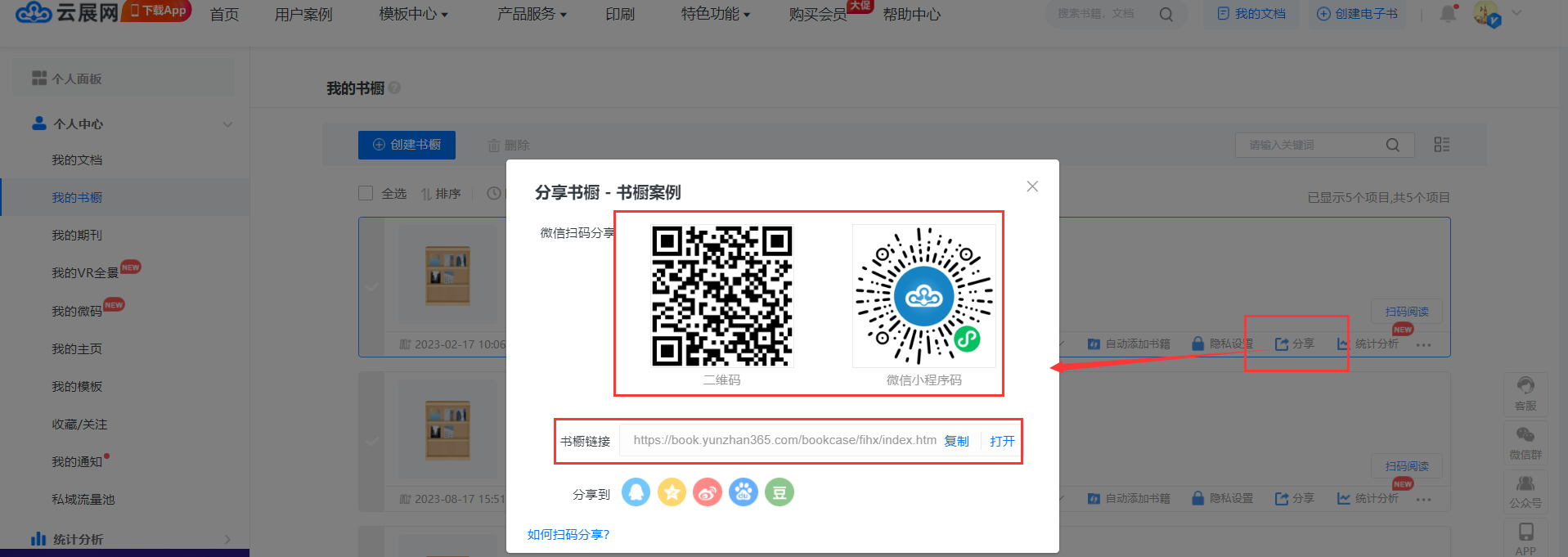 把文檔上傳到云展網(wǎng)后,在【我的文檔】中找到相應(yīng)的電子書,如下圖操作就可以看到書籍的鏈接/二維碼和小程序碼