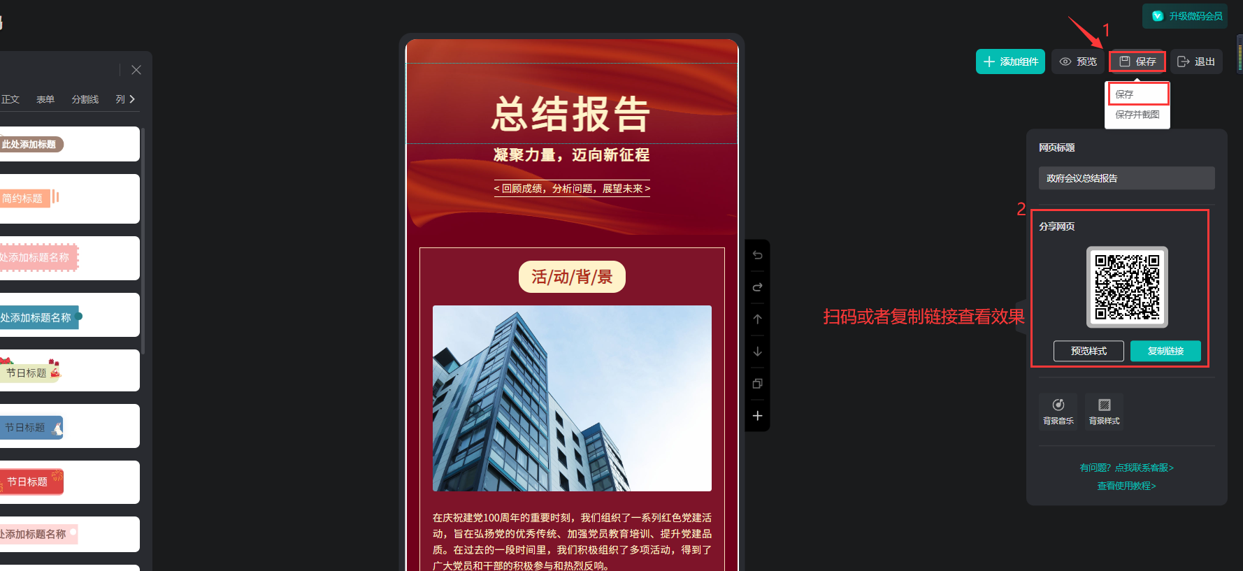 編輯排版好后點(diǎn)擊右上角的【保存】,保存后可以生成微碼鏈接和二維碼分享。