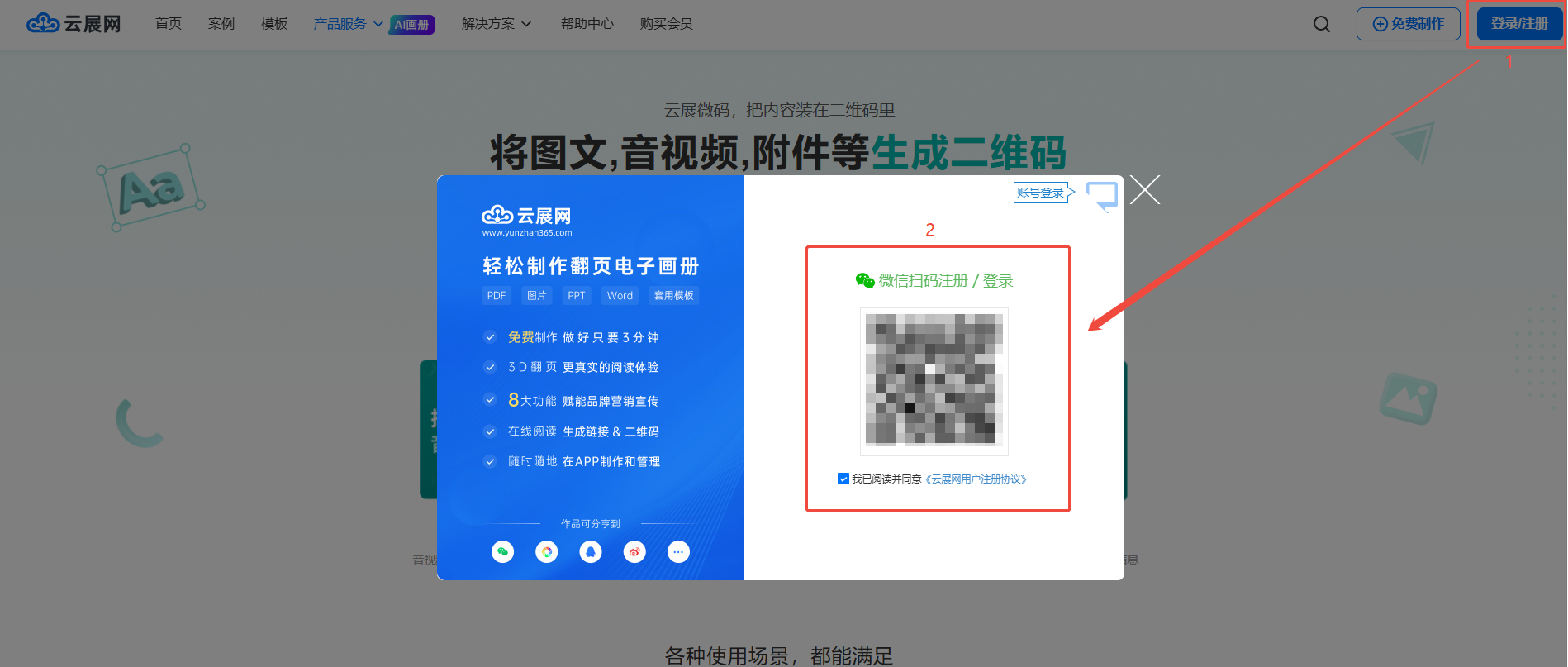 打開(kāi)云展微碼鏈接,點(diǎn)擊右上角【登錄/注冊(cè)】,微信掃碼注冊(cè)。