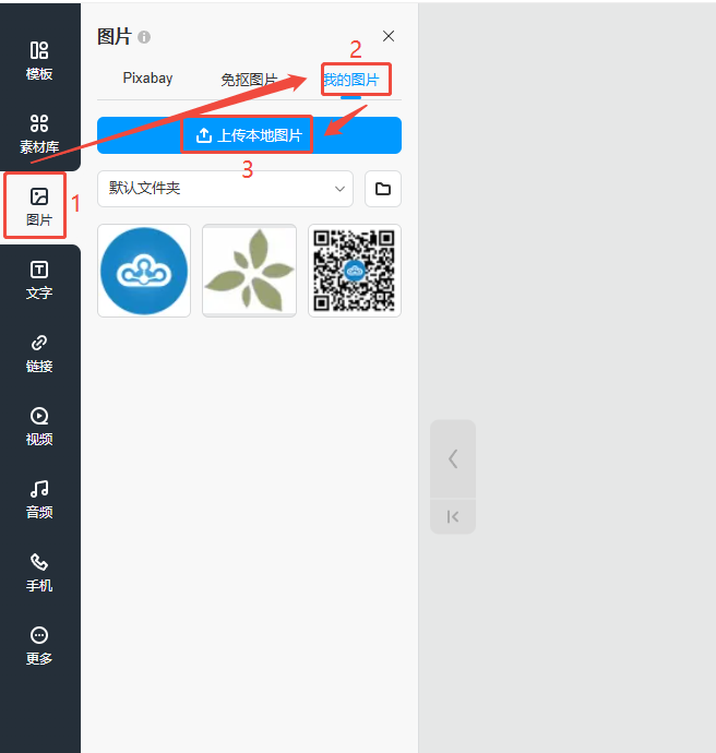 (1)點(diǎn)擊【圖片】,然后點(diǎn)擊【我的圖片】,再點(diǎn)擊【上傳本地圖片】并選擇電腦上的圖片文件。