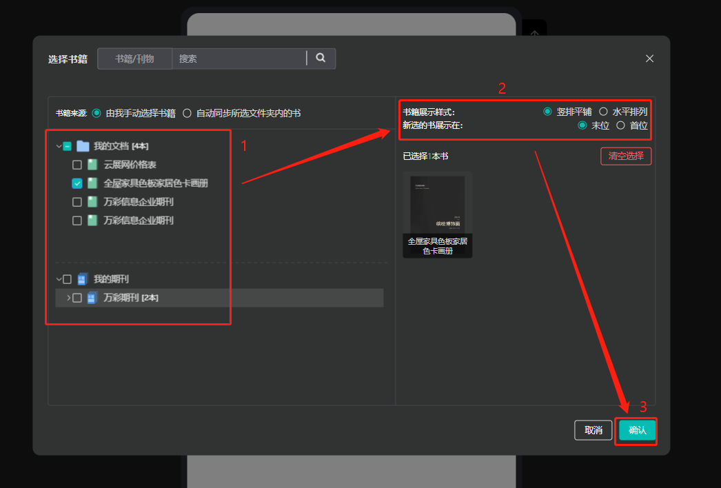 左邊勾選要添加的電子畫冊(cè),右上角選擇【展示樣式】和【展示位置】,最后點(diǎn)擊右下角【確認(rèn)】。