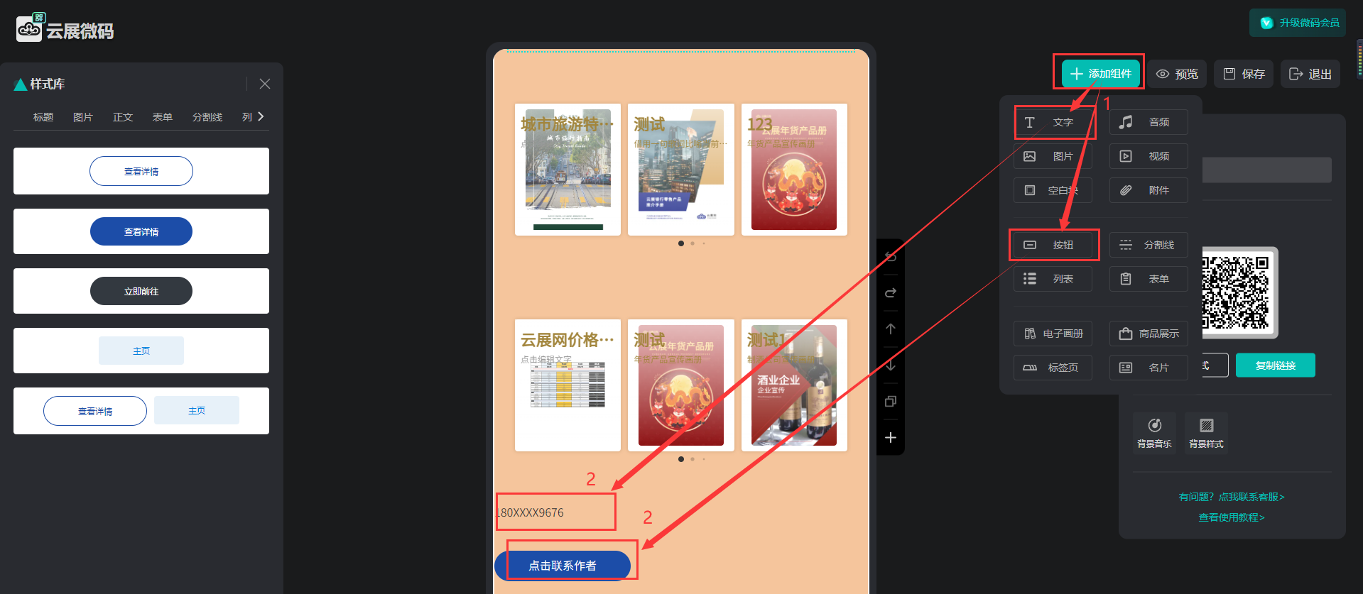 點擊【添加組件】,點擊【文字】或者【按鈕】,輸入聯(lián)系電話號碼/聯(lián)系作者